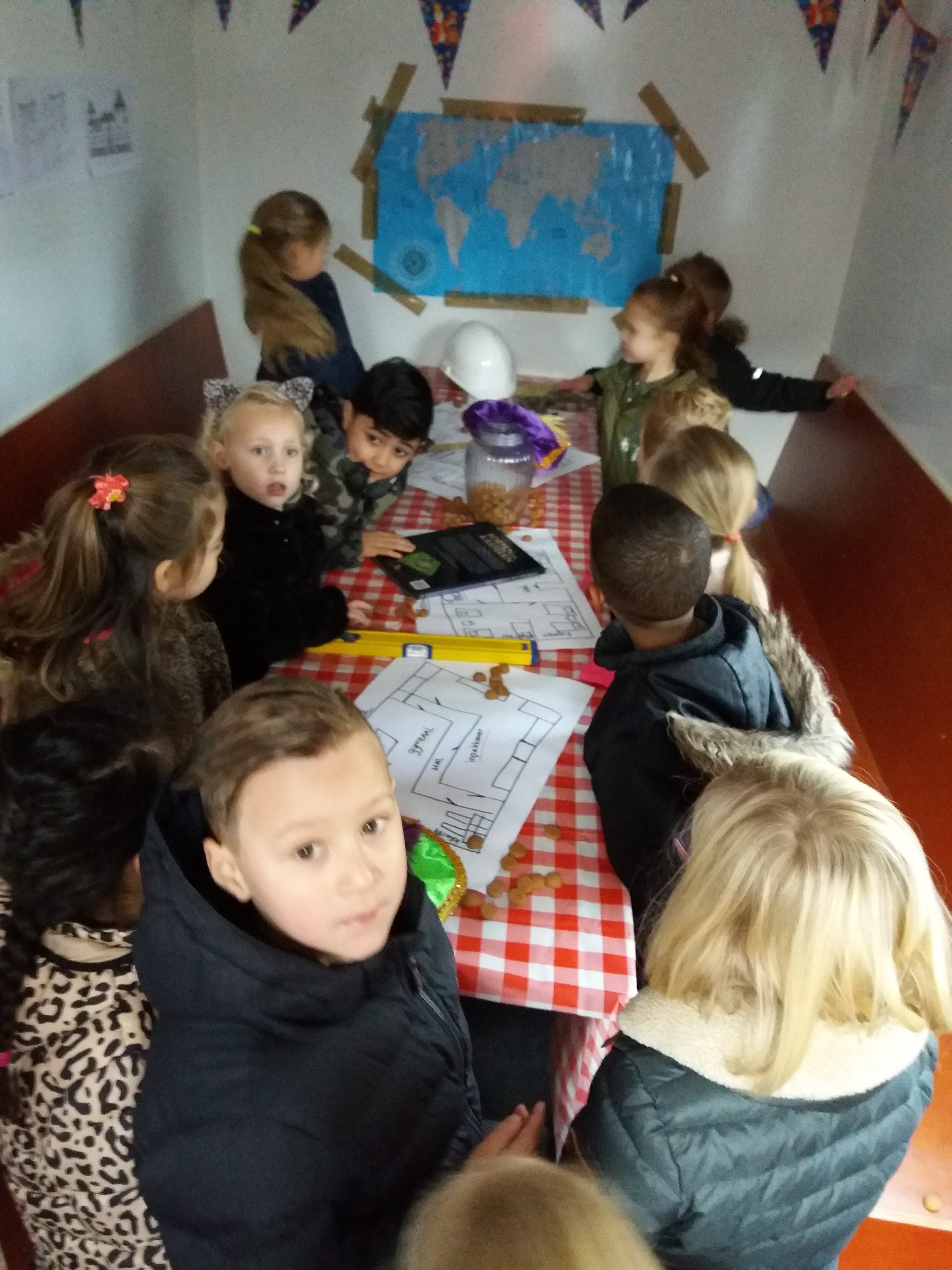 Het was een groot mysterie….maar dat werd al snel opgelost door de Gorilla’s. Nieuwsgierig als wij zijn, gingen we snel buiten kijken. Op de strobalen die er voor liggen konden we klimmen en naar binnen gluren door het raam. Er lagen allerlei papieren, een boek over kastelen, een bouwhelm, werkschoenen en gereedschap. Toen Jayden de sleutel vond die ingepakt op het stro lag, konden we binnen poolshoogte nemen. We snapten al gauw wat hier aan de hand is: de bouwpieten zijn in de buurt. Natuurlijk! Sint wil graag een nieuw kasteel bouwen in Spanje! En zijn bouwpieten zijn er al mee bezig. Wij gaan Sint helpen in de klas. We gaan allerlei kastelen bouwen en tekenen, zodat Sint kan kiezen wat hij graag wil. Daar zijn we binnen ook meteen mee begonnen. Nog maar een paar nachtjes en dan kunnen we het aan Sint laten zien….